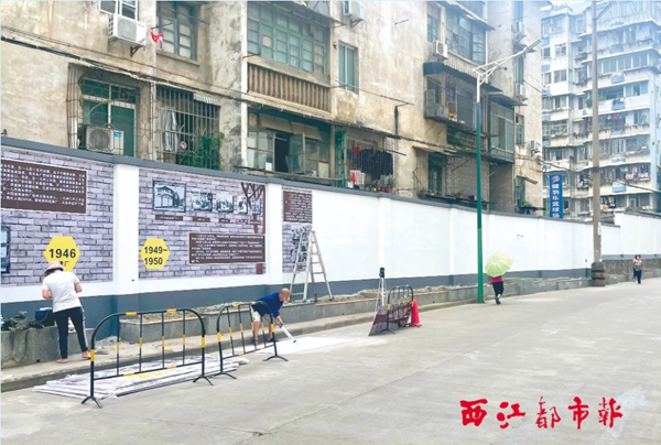6月14日,施工人员正在梧松生活小区外侧道路进行墙体美化。