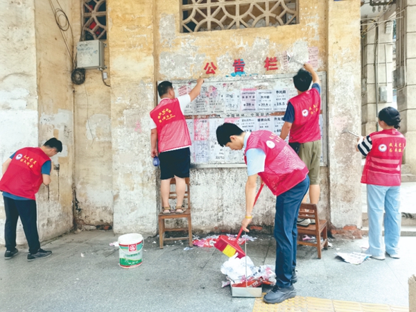 志愿者在清理“牛皮癣”小广告,清扫地面。(南中社区供图)