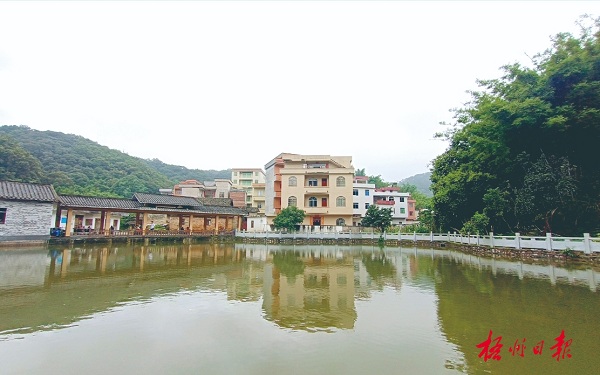 5月29日,在龙圩区广平镇调村,一排村舍倒映在池塘里。近年来,该村积极改造村容村貌,发展产业振兴乡村,配套建设道路、绿化、排水等设施,乡村面貌变得越来越美丽。