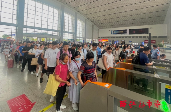 7月29日,旅客在梧州南站排队进站候车。当前暑假过半,市民们出行热度不减,梧州南站里乘客络绎不绝。