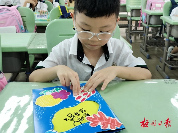 教师节临近,梧州市凤翔小学部分学生动手制作了心意满满的教师节贺卡,表达对老师的感恩之情。该校238班学生朱贻鸿选择了不同肌理、色彩的纸做封面,又综合运用镂空、立体折叠等,将自己对老师的感恩之情藏在贺卡的每一个细节中?!袄鲜π量嗔?,祝愿工作顺利,生活愉快!”朱贻鸿在贺卡写上祝福语。片片贺卡铭师恩,一张张精美的手工贺卡,是最诚挚的教师节节日礼物。收到贺卡的老师纷纷表现出惊喜与感动,脸上洋溢幸福的笑容。