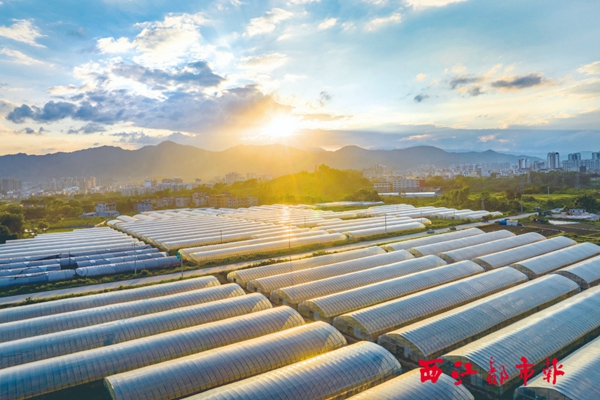 近日,无人机视角下的蒙山县蒙山镇文平村大棚蔬菜基地被晚霞映照得美轮美奂。